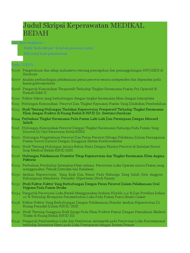 Judul skripsi keperawatan medikal bedah. - Ketik kode skripsi di kotak pencarian judul - Klik judul hasil penelusuran Kode. BEDAH Cara lihat ringkasan -. Oleh sebab itu kali ini admin akan membagikan kalian semua tentang judul skripsi keperawatan medikal beddah yang mungkin bisa di jadikan sebagai bahan referensi.