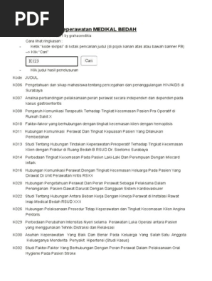 Judul Skripsi Keperawatan MEDIKAL BEDAH Cara lihat ringkasan. Judul Skripsi Keperawatan MEDIKAL BEDAH Cara lihat ringkasan - Ketik kode skripsi di kotak pencarian judul- Klik judul hasil penelusuran.