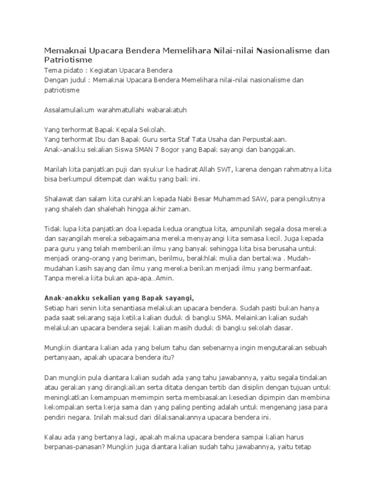 Ibu dan Bapak Guru yang saya hormati serta teman-teman yang saya sayangi Mengawali pidato pada hari ini marilah terlebih dahulu kita memanjatkan rasa puji dan syukur kita kehadirat Allah SWT Tuhan Yang Maha Esa atas segala limpahan rahmat dan karunia-Nya sehingga kita dapat hadir pada acara pagi hari ini. Contoh Pidato Singkat Bahasa Inggris Tentang Nasionalisme Dan Artinya Indonesian Language Adjective. MAAF MASIH DALAM PENULISAN Demikianlah pidato tentang nasionalisme yang bisa didownload gratis untuk keperluan berpidato.