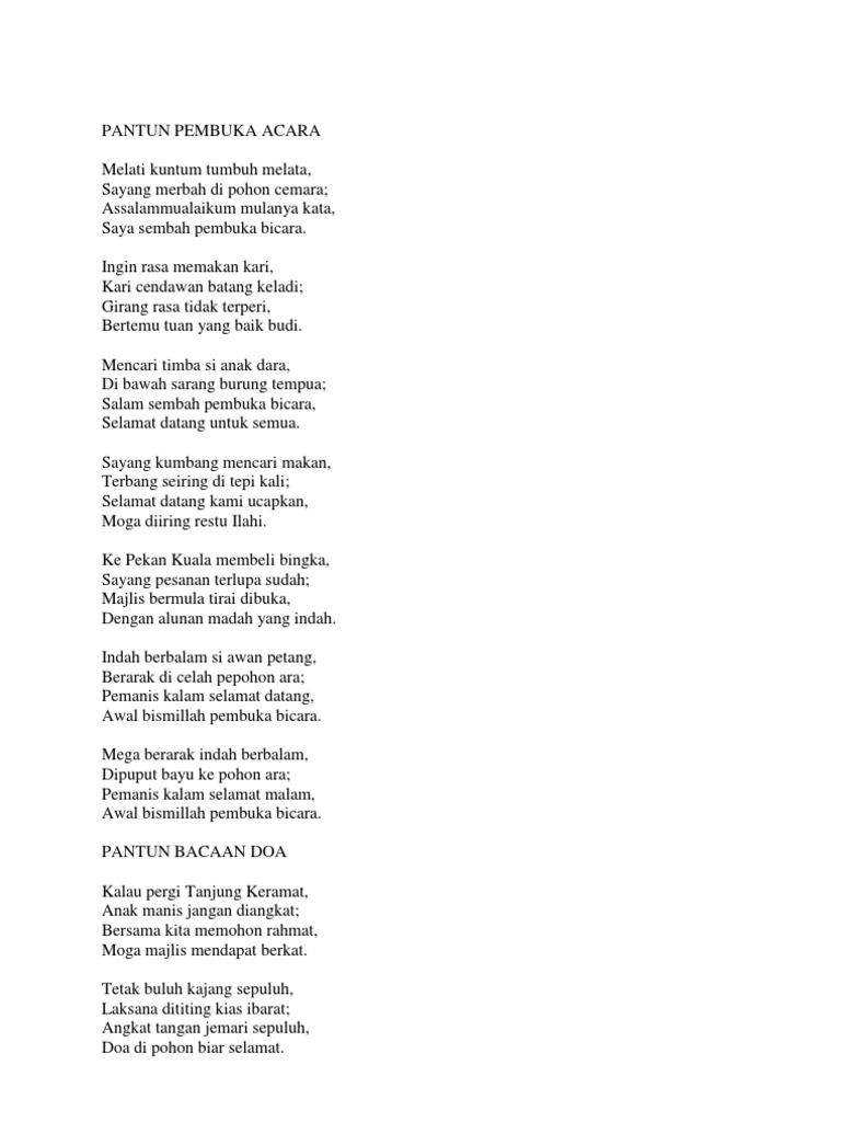 AdaHobi Pantun penutup acara Pantun merupakan salah satu karya sastra lisan berupa puisi lama yang sampai saat ini sering digunakan dalam berbagai macam acara saat penutupan acara wisuda pengajian ceramah pidato presentasi maulid resepsi pernikahan dll yang disuarakan oleh MC baik menggunakan bahasa Indonesia Jawa Sunda atau bahasa daerah setempat. Contoh Pantun Pembukaan Salam dan Penutup Acara Pantun adalah puisi lama Melayu Indonesia yang memiliki empat baris terdiri dari 2 bait sampiran dan 2 bait bagian isi.